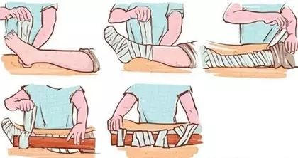 不要移动身体,尽快把伤到的肢体用夹板固定住。夹板可用木片或折叠起来的报纸或杂志制成,放在受伤的肢体下面或侧面,用三角形绷带、皮带或领带缠住夹板和受伤的肢体。不要缠得太用力,不要用纱布或细绳子,这些都可能阻碍血液循环。